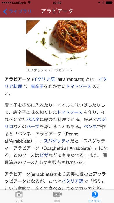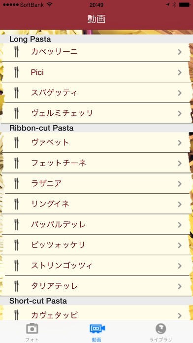 パスタ好きピッタリのアプリ。パスタの写真や動画、パスタ料理の詳しい説明が勉強になる