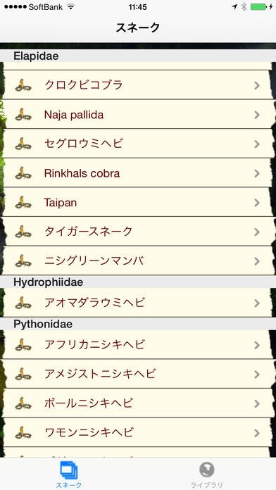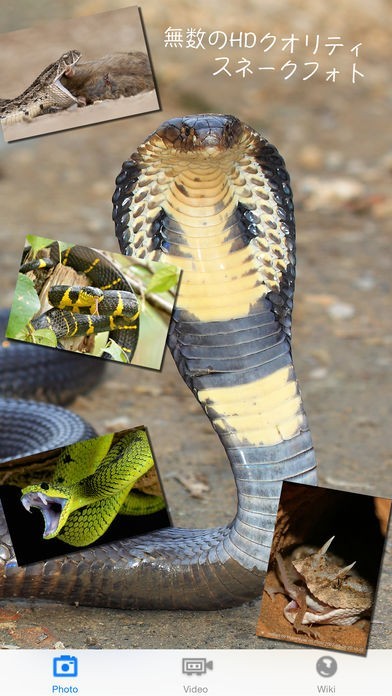 アプリで鑑賞できる画像はどれね蛇を接写したもので、色、形、凹凸といった細部までも確認できるようになっています。国内の一般的にものから世界各国の珍しいものまで、蛇の画像がコレクションされています。