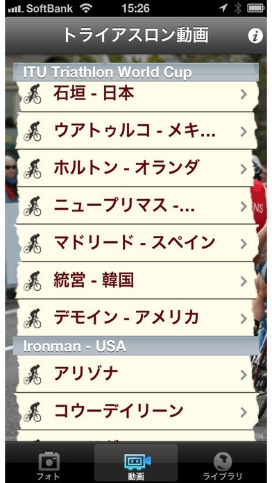 App Storeより引用世界のトライアスロンレースをiPhoneで観戦!ワールドカップやアイアンマンレースといった有名レースを40以上も収録。迫力満点の動画や写真でトライアスロンを楽しめます。また、トライアスロンに関するライブラリも充実。
