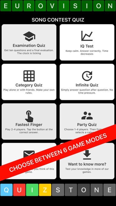 制限時間内に10問限定の問題の正解数を競う「試験モード」、ソングコンテンストに関するIQを調べる「IQテスト」、2から4人でプレイする「早押しモード」などなど魅力的なクイズ形式が6つも用意されています。