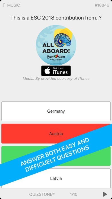 欧州放送連合加盟放送局によって毎年開催されている音楽コンテストである「ユーロビジョン・ソング・コンテスト」にまつわるクイズを楽しむことができます。各国の代表者が頂点を目指して歌を披露する一大イベントのファンなら間違いなく楽しめるコンテンツです。