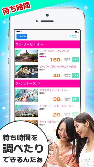 「ランドへGO!」を使えばディズニーランドやシーの楽しみが広がります。このアプリの便利な機能として、アトラクションの待ち時間の確認が出来ます。園内を歩いて待ち時間を確認をする必要がなくなりとても快適です。その他、当日のショーの開催時間のスケジュールとお知らせアラーム機能があるので、遊ぶのに夢中で時間を忘れたりする事を防止できます。また夕食を選ぶ際はiPhoneの画面でレストランの検索は勿論、メニュー確認まで出来るので非常に便利です。