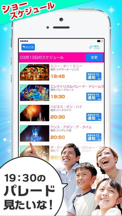 当日開催されるショーの一覧から観たいショーを選ぶとアラームで開始時間を教える機能が搭載されています。