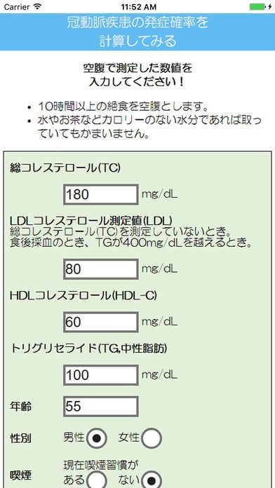 App Storeより引用「日本動脈硬化学会(編) 動脈硬化性疾患予防ガイドライン2017年版」に基づき、血清脂質や血圧値などから10年以内の冠動脈疾患発症確率とリスクの程度を算出します。