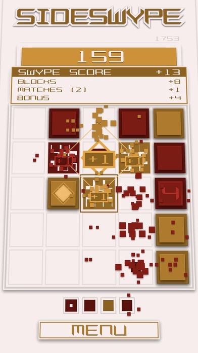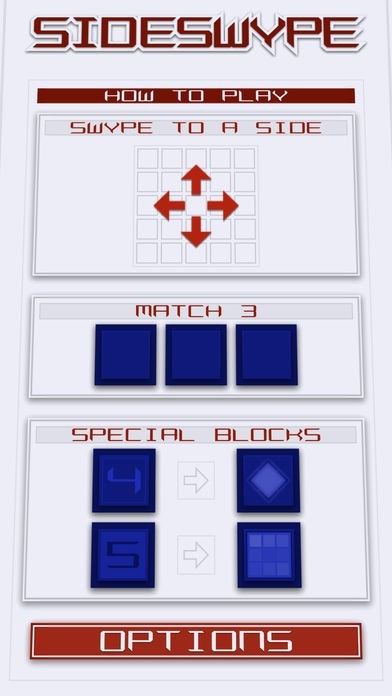 Swype your finger across the screen to send the blocks sliding to one of the 4 sides of the grid. Match 3 or more in a row to destroy the blocks. Special 4 and 5 blocks appear on occasion, requiring larger matches and rewarding you with special Diamond and Bomb blocks in return.