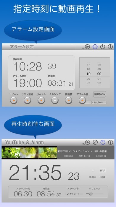 YouTubeの動画を指定して、目覚ましい時計代わりとして使うことが可能!
