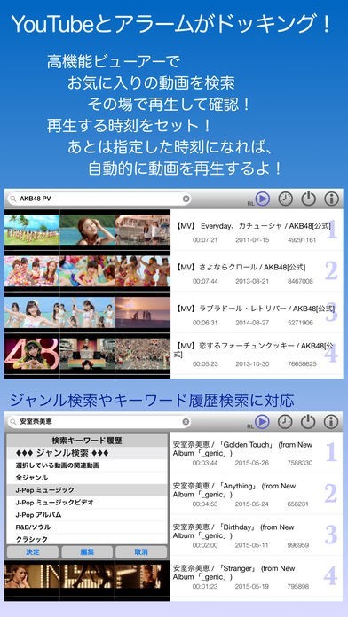 学生や社会人など朝が苦手な人の多くは、アラーム音がトラウマ、なんて人も少なくはありません。そんなユーザーはMVとインタビュー動画など目覚まし代わりのシーンをピックアップし、好きなアーティストやアイドルで快適な目覚めを実現させましょう。