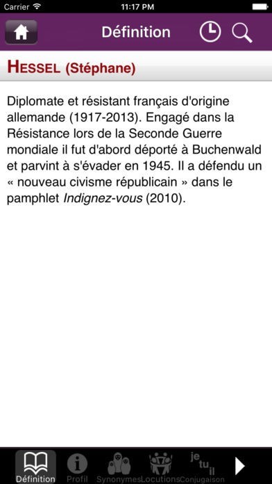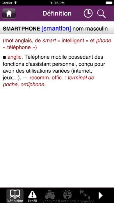 仏単語の意味がフランス語で書かれている辞書なので、初学者は解説文の単語まで調べることになります。大変手間のかかる作業になりますが、閲覧した単語の履歴が残るので、そこから以前見ていた単語のページに簡単に戻れるので苦労せず多くの単語を調べられます。