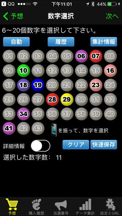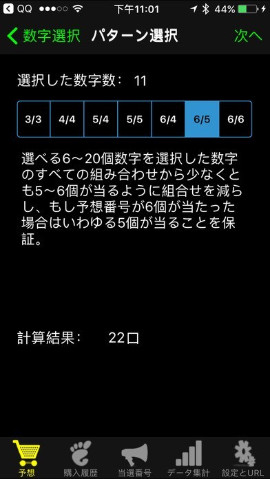 選択した予想番号数字の全ての組合せより減らします。3/3、4/4、4/5、5/5、4/6、5/6、6/6七つのパターンを選択します。5/6:もし予想番号が6個当たった場合は、5個数字が当たることを保証できます。(お勧めのパターン) 例:11個数字選択場合 6/6:462口 5/6: 22口 4/6: 5口