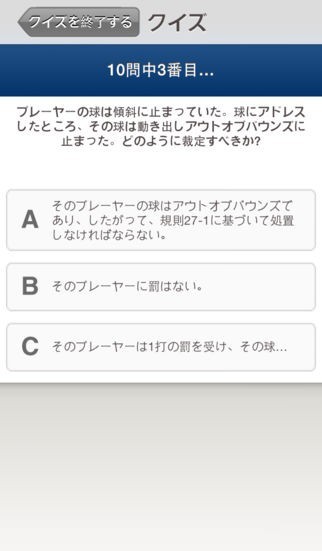 クイズ機能が搭載されていてこのアプリに書かれているルールをちゃんと正しく覚えられたかをチェックできたり同じゴルフの趣味を持っている友達と問題を一緒に考えたり話したりするのに使えます。