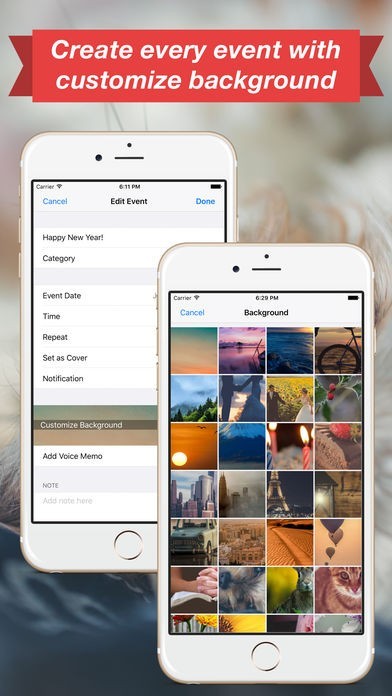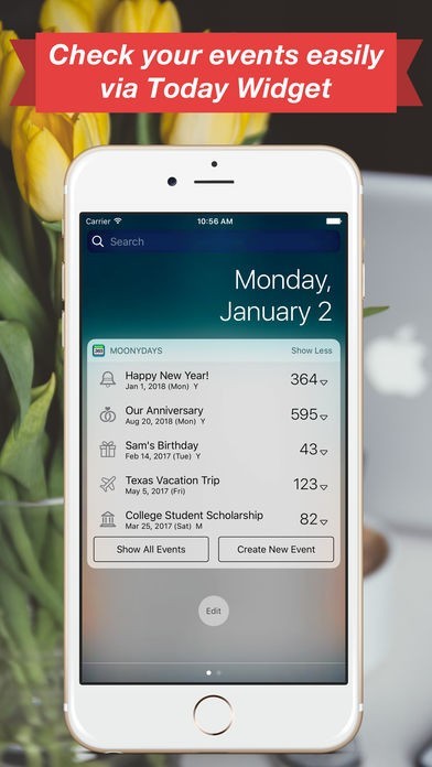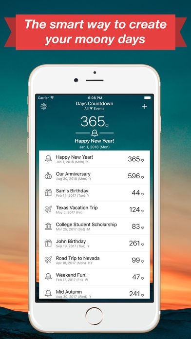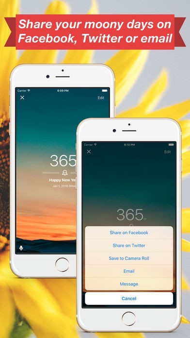 With Moonydays Pro – Event Countdown Timer to gala days, you will be able to customize each count down event with your personal background, add notes, record voice memos that reflect your feelings beyond words, and share your delight with friends on Facebook, Twitter, Email or event you can save to Camera Roll.