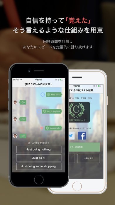 「レアジョブ瞬間リスニング」では実際にありそうな状況のリスニングを行うことが出来ることから、実際に旅行をした際などに役に立つこと英語を学ぶことが出来ます。 リスニングに回答していくのですが、答えるまでの時間を計測していて、迷って正解したのか、そうではないのかをアプリ側で判定してくれるので、自分が確実に理解しているのかどうかを知ることが出来ます。 そして、しっかりと理解することが出来る様になるまで何度でも学習し直すことが出来ます。その結果をランク表示してくれて、ツイッターやフェイスブックに共有することができるので、いい成績だった場合には皆さんに自慢しちゃいましょう。 最速で答えるようになればもう心配は必要ありません。