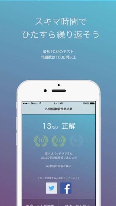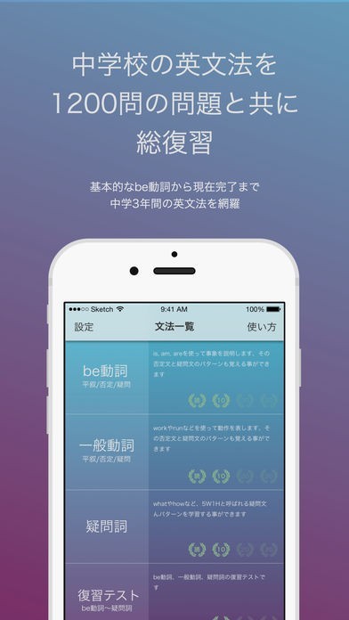 アプリには約1000問を超える問題が収録されているので、飽きることなく解くことができます。基本的なbe動詞から現在完了形まで中学3年間の文法が入っているので、長く使うことができます。