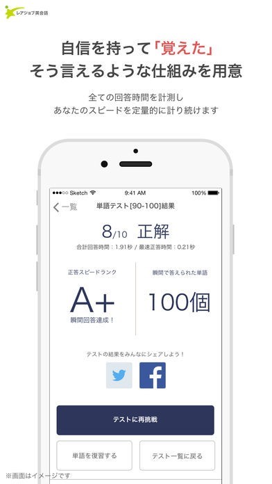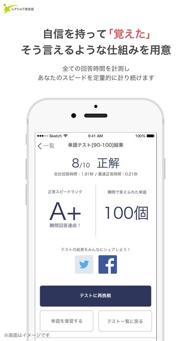「レアジョブ瞬間英単語」では、TOEIC600点レベルで必要となる英単語を収録した単語カード機能などを用意しています。まずは単語カードをめくって暗記をしていきましょう。休憩時間や電車の待ち時間でも手軽に利用できるため、隙間時間を有効活用できるのが嬉しいポイント。次にテスト機能を使って、出題される単語をどんどん答えていきます。テスト結果には正解率やスピードランクも表示。自分の正解率を具体的に把握できる他、ランクアップを目指してモチベーションを保つこともできます。テスト結果はシェア機能からSNSに投稿可能。正解率やスピードを友達と競い合ってみてはいかがでしょうか。