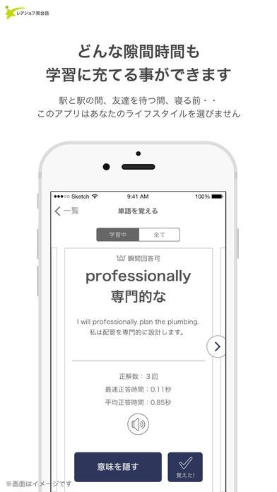 最短10秒以内の学習時間!駅と駅の間・友達を待つ時間・寝る前、時間を選ばず英単語を学習する事ができます。