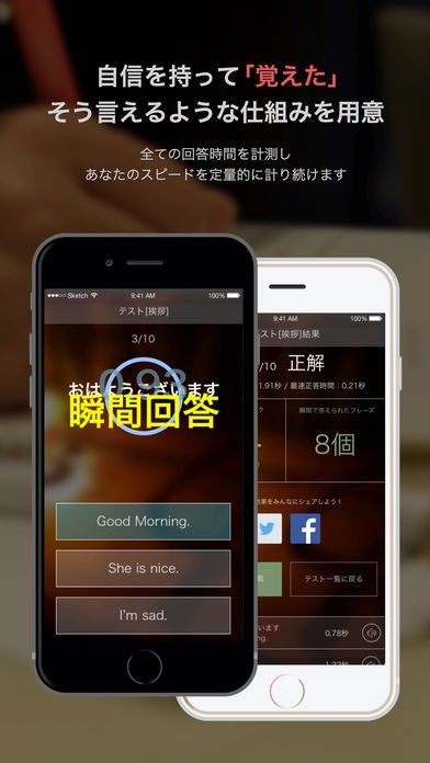 通勤通学の隙間時間にも利用できる英語学習アプリとして、使いやすいテスト機能などが充実しています。まずはテストに対して出来るだけ早い時間で回答していきましょう。瞬間的に回答を続けることによって、英単語を身につけられるのがこのアプリの特徴となっています。成績機能からは正解個数や正答スピードランクの確認が可能。正答スピードランクは22段階に分かれ、学習成果によるランクアップでモチベーションを維持することもできます。友達とテスト結果を共有できるシェア機能も搭載。TwitterやFacebookの友達と一緒に、スピードランクSSSを目指してみてはいかがでしょうか。