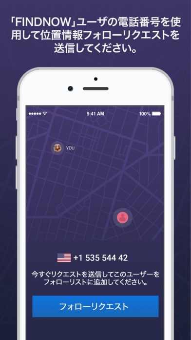 App Storeより引用FindNowは位置の共有および探知をしてくれるすばらしいアプリです。相手の電話番号があれば位置を把握しておきたい人とつながることができます。