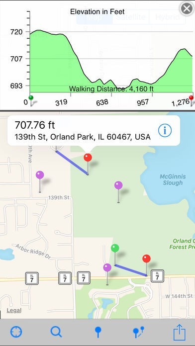 App Storeより引用Elevation Chart is a tool used to get the elevation of any place on the surface of the Earth. You’re able to place a pin anywhere on the map to view it’s elevation in feet or meters along with its longitude, latitude, and address. You can also place two pins on the map to see the elevation profile and walking distance between the two points.