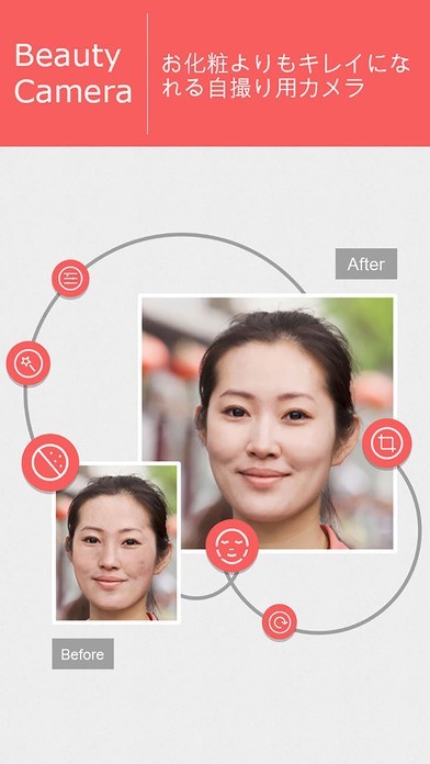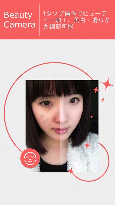 せっかくの写真だから、できるだけ綺麗に写りたい! ニキビ跡やシミが目立つから写真は苦手。 そんな悩みに答えてくれるカメラアプリです。 アプリを起動して写真を撮れば、気になるニキビ跡やシミを綺麗に消してくれます。 撮影後の写真に対して、肌の白さなどを調整できる機能も搭載。 思いのままに美肌加工を行えば、写真撮影がきっと楽しくなります! 操作はシンプルで簡単。美白加工にも難しい技術は不要!タップのみでいつでも綺麗な肌を実現できます。 お肌が気になる女子向け自撮りアプリとしても最適です!