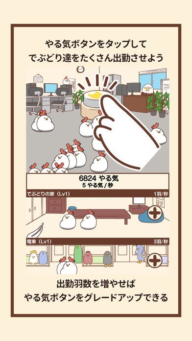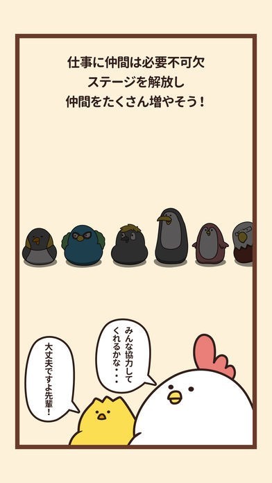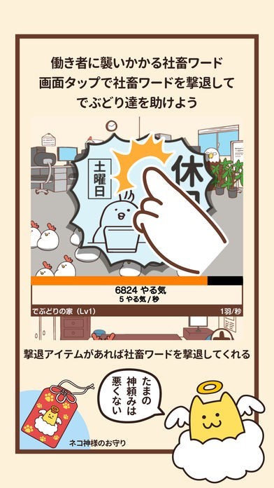 ボタンタップで、でぶどりたちをヤル気アップさせて働かせたり、残業や休日出勤などのワードが出現したらタップして撃退し働きすぎを防いであげることで、程よく働くことを応援してあげるストレス解消ゲームです。ゆるかわいい「でぶどり」たちに癒やされながら働くことの意味を一緒に見つけていきましょう。