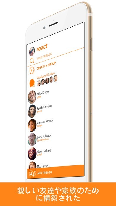 「React Messenger」では、自分の顔など撮影した画像をスタンプのように使えることから、他ではできないようなオリジナリティあふれるコミュニケーションをすることができます。 よって、自分の顔がお好きな方などが使うと楽しめることは間違いないでしょう。 さらには、フォントも堅苦しくないようなものなのでこちらの気分も上がります。 以上のような機能から顔を知っているようなリアルな友達や家族などとのみ使うことができ、より親しさを感じ、インターネットでの冷たい関係を解消してくれますし、グループチャットでサークルでのやり取りや家族会議などを行うことも可能です。