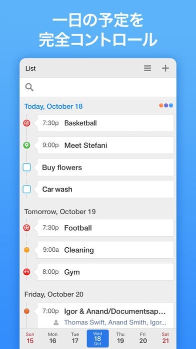 スマートフォンでもパソコンでもスケジュール管理を行いたいという方には、カレンダーアプリ『Calendars by Readdle』が便利です。 Googleカレンダーとの同期機能を搭載しており、パソコンでGoogleカレンダーに入力した内容も手軽にアプリへと同期可能。 複数のデバイスで同じスケジュールを共有することができます。 スケジュールの並び替えもドラッグ&ドロップで簡単に行える他、検索機能なども搭載。 予定について確認したくなったら、検索から手軽にスケジュールを呼び出せます。