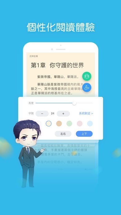 模仿真書翻頁3D效果、設定閱讀字體大小、日夜模式、背景顏色亮度可調節