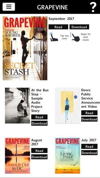 App Storeより引用Grapevine magazine is the international journal of Alcoholics Anonymous. Written, illustrated, and read by and for members and others interested in the AA program of recovery from alcoholism. Grapevine is a lifeline linking one alcoholic to another, communicating the experience, strength, and hope of its contributors and reflecting a broad geographic spectrum of current AA experience with recovery, unity, and service.