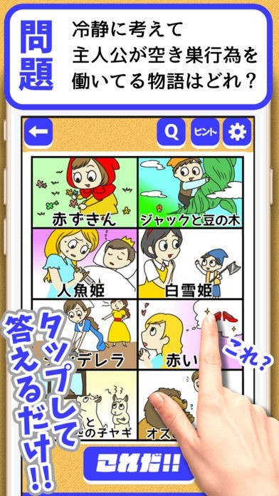 西洋と日本の昔話がシュールでツッコミどころ満載になった感じですww笑えますw出題される問題い当てはまる絵をタップするんだけど、絵が本当にシュールで面白いw