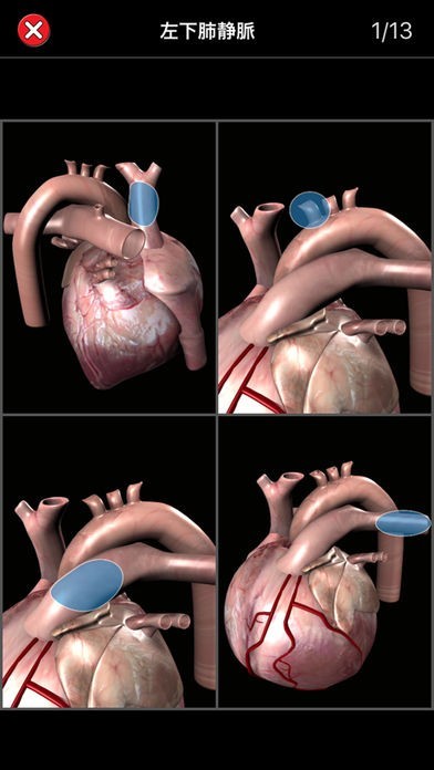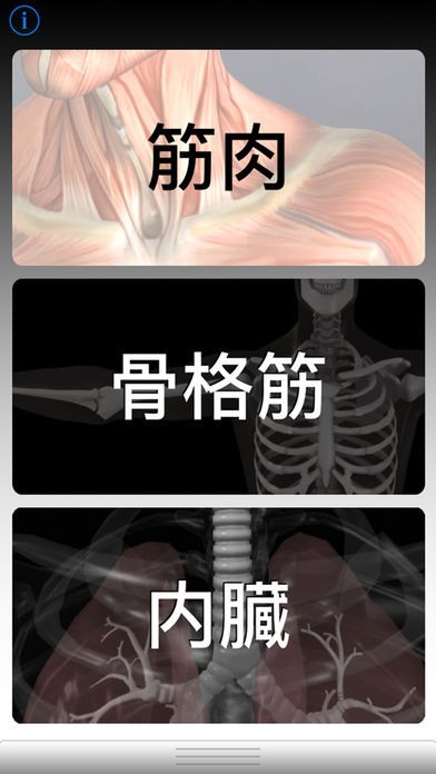 4つの3D画像とともに新しい解剖学の名称を覚えていくモードと、選択問題形式でテストに挑戦するモードの2種類のモードが収録されています。自分に合った方法で学習を進められます。