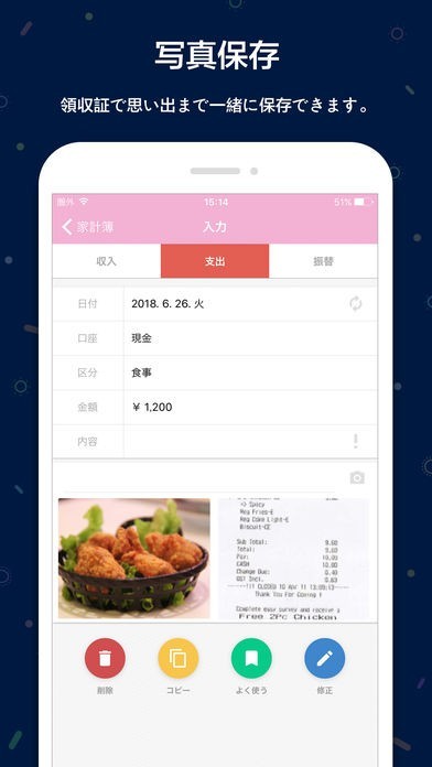 領収書などの画像を記録することが可能です。領収書だけでなく、アミューズメント施設へ行った際の入場料、外食をした際の飲食代などの出費の部分にその時の画像を載せることで、楽しい思い出として振り返ることもできます。