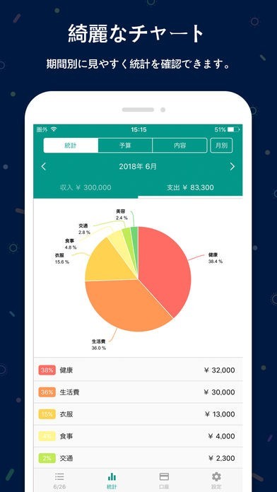 チャート表示!カテゴリーごとに表示されるので、出費の割合が一目でわかる