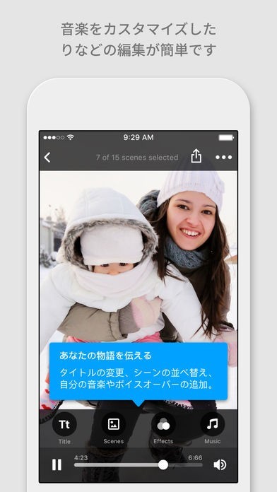 家族の動画や写真をまとめて作品を作りたいという時には、動画作成アプリ「RealTimes」が便利です。ムービーを自動作成する機能を搭載。スマートフォンに保存された動画や写真をアプリが自動的に選んで組み合わせ、「ストーリー」と呼ばれるムービーを作成してくれます。最高の瞬間を厳選して自動編集をしてくれるため、ムービー作成や編集は苦手という方でも気軽に利用することができるでしょう。もちろん編集機能も用意。作成されたムービーにフィルターを加えたり、シーンにぴったりな音楽を付け加えることもできます。また、素敵なムービーが完成したら、シェア機能でSNSの友達と共有できるのも嬉しいポイントとなっています。