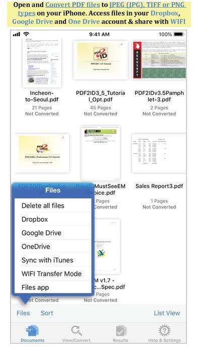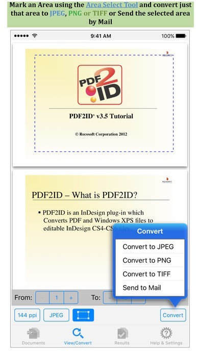 Convert PDF files to JPEG (JPG), PNG or TIFF images instantly with a simple tap. Mark specific areas to convert using the Area Select tool and have it editable on your iPhone!