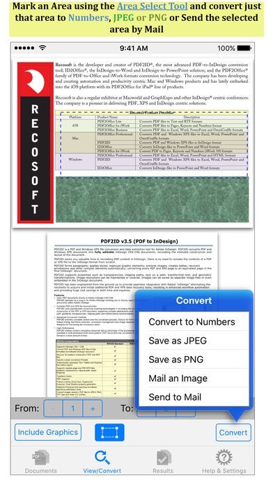 * Mark just the area within a page to convert. You can convert just the selected area to Numbers, JPEG or PNG image even