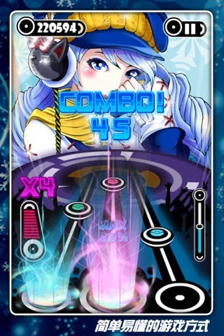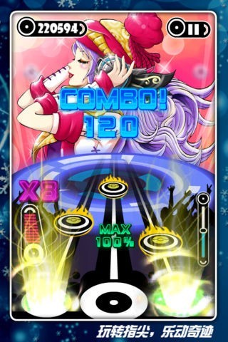 ●初次进入游戏,只需短短十几秒,玩家就可以用屏幕上的3个按键掌握基本的游戏方法,伴随着音乐节奏演奏出动感十足的音乐。游戏采用解锁模式,玩家在挑战不同难度音乐的过程中能够不断提升自己的游戏技巧。