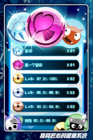 ●游戏内更有各种独具匠心的徽章供玩家收集,无论是你是菜鸟新人,还是音乐游戏达人,均可在游戏中根据自己的兴趣和特长获得相应的徽章。