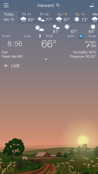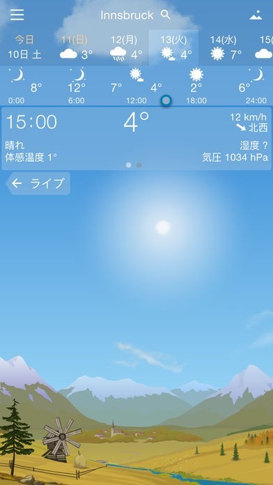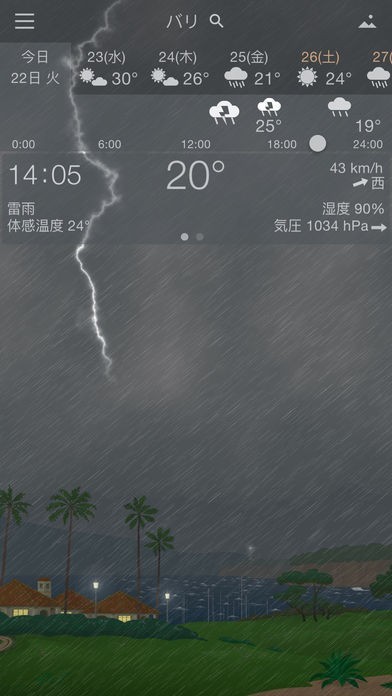 一日をタイムで天気や気温風速などを予想で表してくれるので1日の天気の流れを知ることが出来てとても分かりやすく便利です。雨や雪、雷などしっかりと映像で表してくれるのがいいと思います。