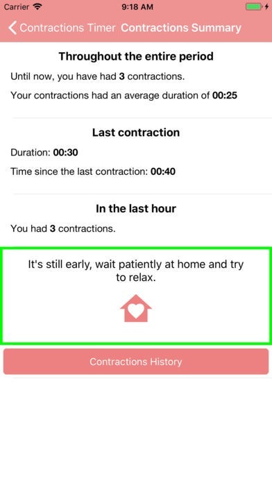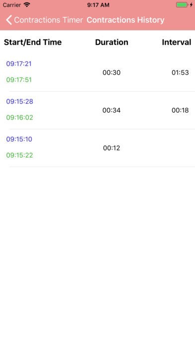 3.収縮トラッカー:ここでは登録したすべての要約を見て、すべての収縮を追跡することができます。妊娠中に痛みのない収縮があるかもしれません(または虚脱も)が、妊娠の最終段階にあるものは重要です。