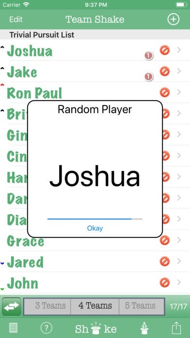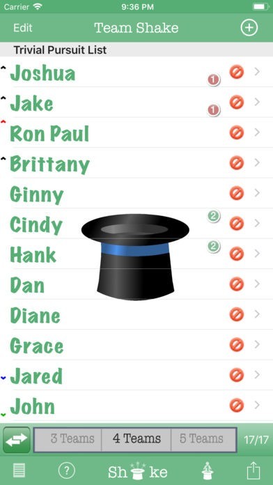 Team Shake is the premier iOS App for creating teams. Instead of a hat and scraps of paper, the user enters his friends' names in his iPhone and gives it a shake. The screen will then display a random set of color-coded teams. These teams can immediately be used for game play or shared via facebook or email. The quick and easy selection of random (or balanced) teams eliminates fighting over who will be on which team. Innovative use of the iPhone shake gesture gives users the satisfying feeling of shaking a virtual hat without the trouble of carrying around an actual hat. Conventional buttons can also be used for those who would rather not shake their expensive hardware about.