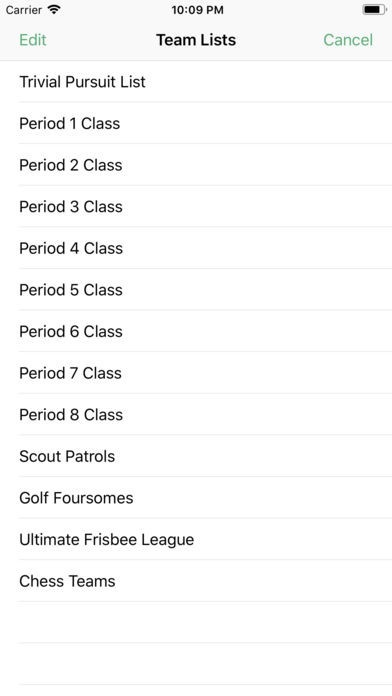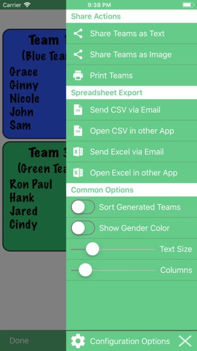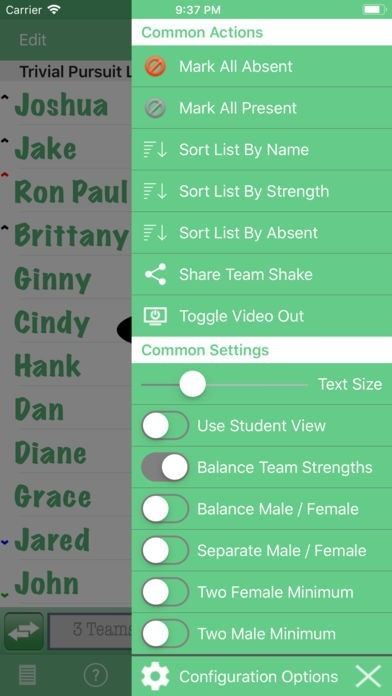 The app is designed with ease of use and simplicity in mind. Names can easily be entered with the onscreen keyboard, chosen from the user's contacts, or imported from a file. The email and facebook functions document the members of each individual team as well as preserving the team number and color assigned by the app. For repeated use of Team Shake, lists of friends can be easily saved and loaded later. The current list is also automatically saved so that if you exit the app, or even reboot the device, changes will not be lost. For teachers and others with large lists of people, Team Shake supports the ability to import teams from text or csv files.