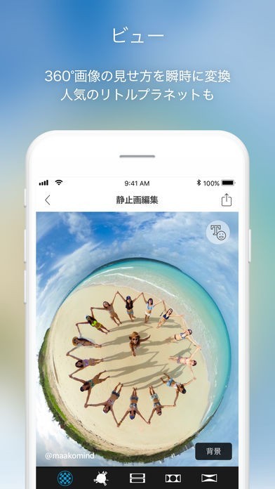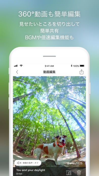 ・トリムや倍速編集、BGMなどの360度動画編集機能にも対応しています。