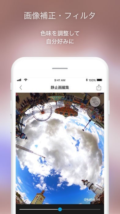 ・360度映像をぐるぐる確認しながら、画像補正やフィルタで全体の色味を調整できます。