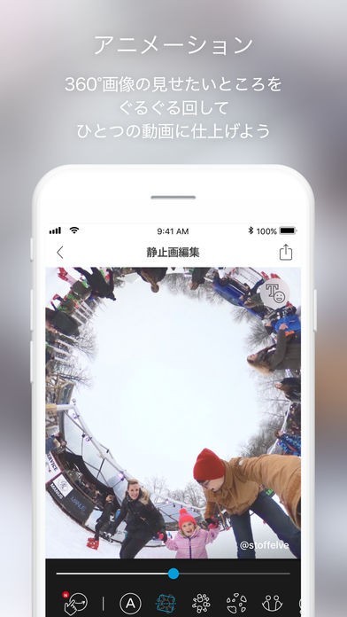 360°画像の中を寄ったり引いたり回転させて、静止画からアニメーションを作成できます。見せたい箇所の選択や動き、速度も自由に設定できます。編集後は動画として保存されるため、360度非対応の環境でもぐるぐると回転させた360度共有が可能です。