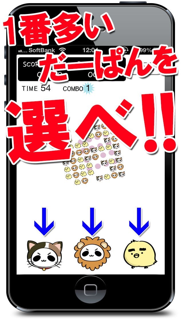 パンダのだーぱんが登場する「大混乱! だーぱんチョイス」は、画面上を流れてくるキャラクター達の中からだーぱんをタップで指定するパズルです。一番多いだーぱんはどれかを瞬時に判断し、タップでコンボしていきましょう。コンボが決まれば大量得点のチャンスです。多彩なコスプレ姿を見せてくれるだーぱんに夢中になること間違いなし。パンダとは思えない姿も見せてくれます。ランキングを搭載し、仲間や友達とワイワイ楽しみながら遊ぶことができます。
