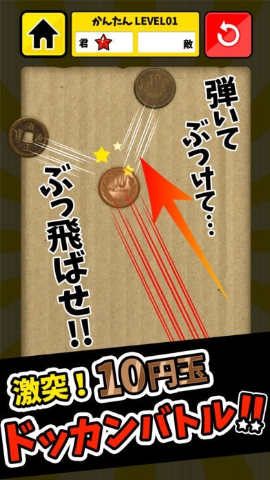 自分の10円(ピカピカな10円)をひっぱってとばして、敵の10円(汚い10円)にぶつけよう!