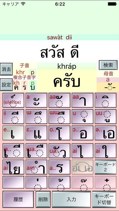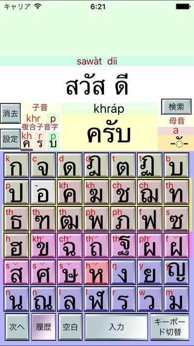 キーボードは子音42個すべてを表示させ、母音もほぼすべてを見やすい大きさで表示してあります。これらの子音と母音の入力を組み合わせてタイ語を入力することができます。