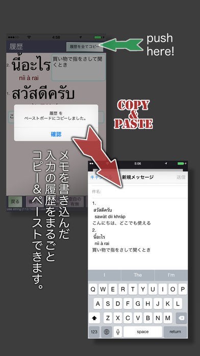 入力したタイ語をメールやメモ帳でも使うことができ、また履歴のメモ帳にはタイ語の意味を保存しておく機能も付いています。最大30行まで保存でき、そのすべてをコピペすることができます。