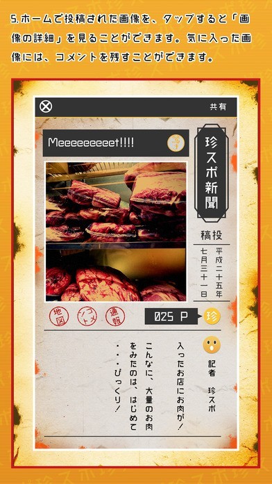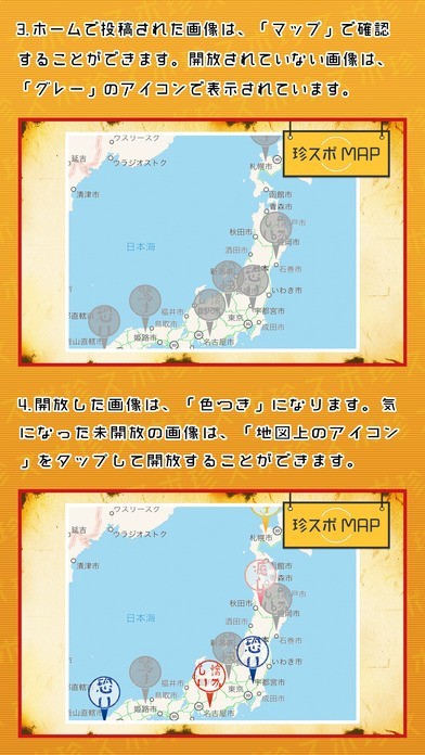 街中や旅行先で見かけたちょっと珍しいスポットや面白いスポット、恐怖のスポットなどさまざまな個性あふれるスポットの写真を閲覧したり、自分で撮影したものを投稿したりすることができるのが珍スポになります。このアプリでは写真を閲覧、投稿することができるだけでなく、投稿された写真を地図上で一覧表示することができるようになっているので興味のあるスポットに直接足を運んだり、写真にコメントを付けたりすることができるようになっています。