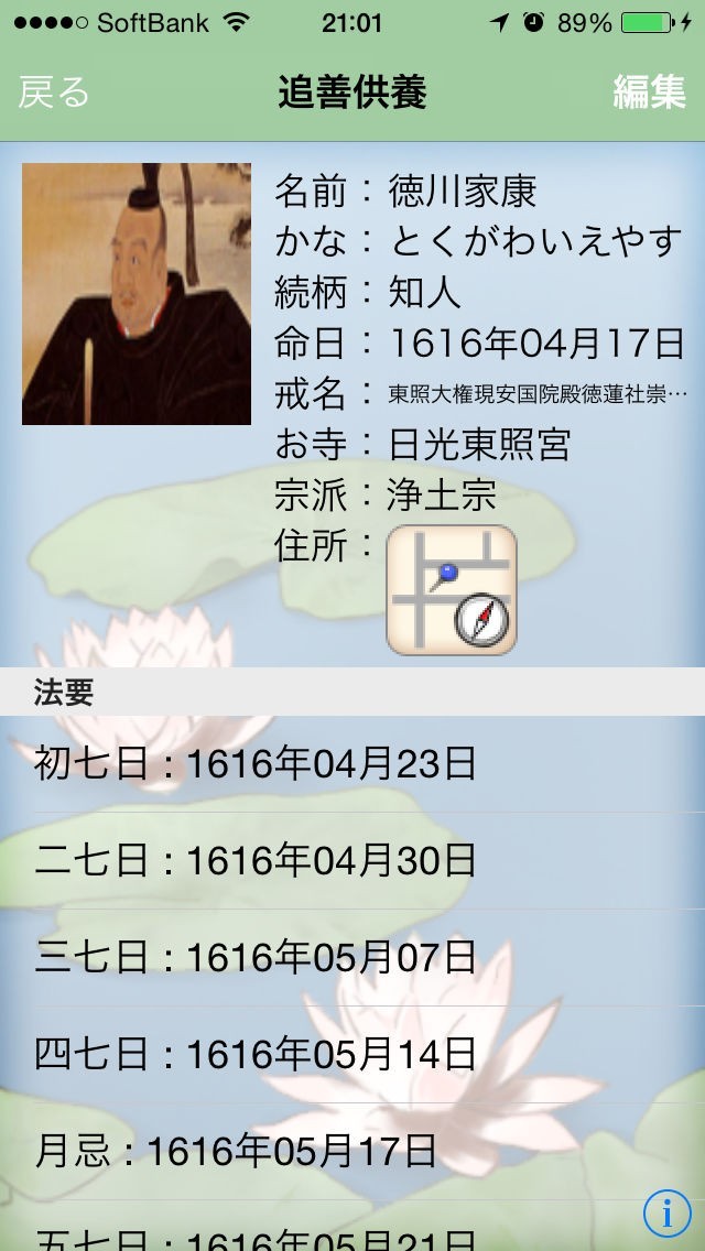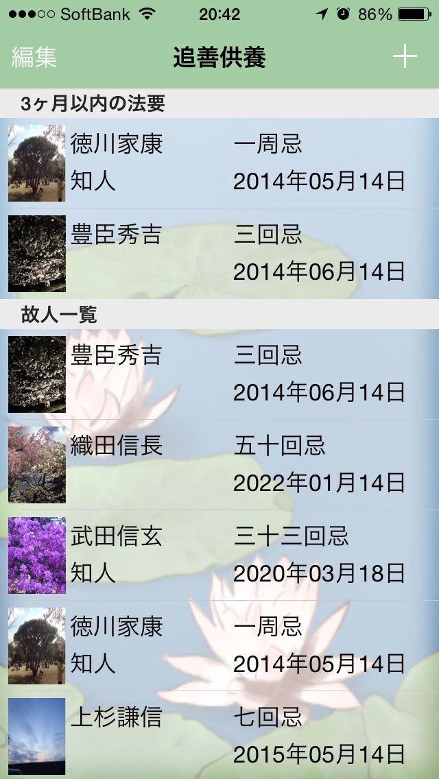 四十九日などの法事のスケジュールをアプリで自動管理することができます。それぞれ命日の年月日を登録すると、代表的な法事の忌日を計算できます。別途計算しなくてもいいので、間違いなくイベントを済ませることができます。